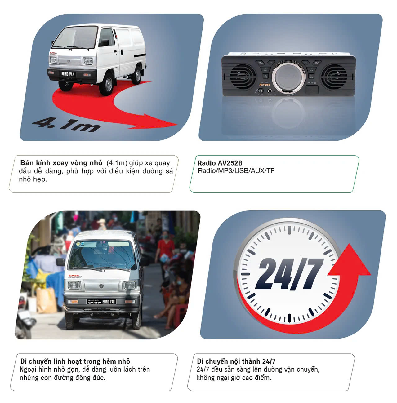 ⏰ Chạy Giờ Cấm: Được thiết kế đặc biệt để đáp ứng các quy định giờ cấm xe tải tại nhiều khu vực, Suzuki Blind Van cho phép bạn vận chuyển hàng hóa mà không phải lo lắng về giờ giấc.