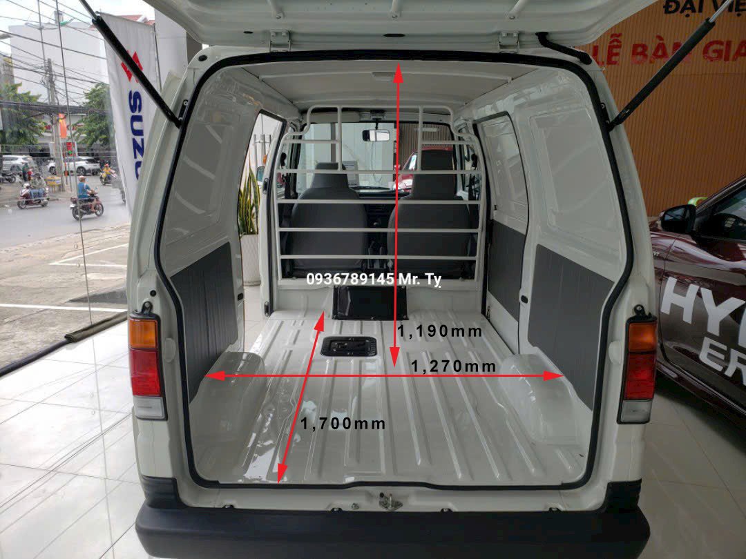 Thùng xe của Suzuki Blind Van vượt trên sự tiện nghi có kích thước vô cùng rộng rãi 1700 x 1270 x 1190 mm. Tải trọng của xe lên tới 580kg với sàn thùng phẳng và chiều cao thùng hàng hợp lý (1,19m). Ngoài ra, thùng xe được thiết kế đảm bảo độ kín giúp xe có thể chuyên chở được nhiều loại hàng hóa khác nhau, ngay cả những mặt hàng đòi hỏi sự khô ráo như thuốc, đồ dùng y tế hay các loại máy móc, đồ điện tử…