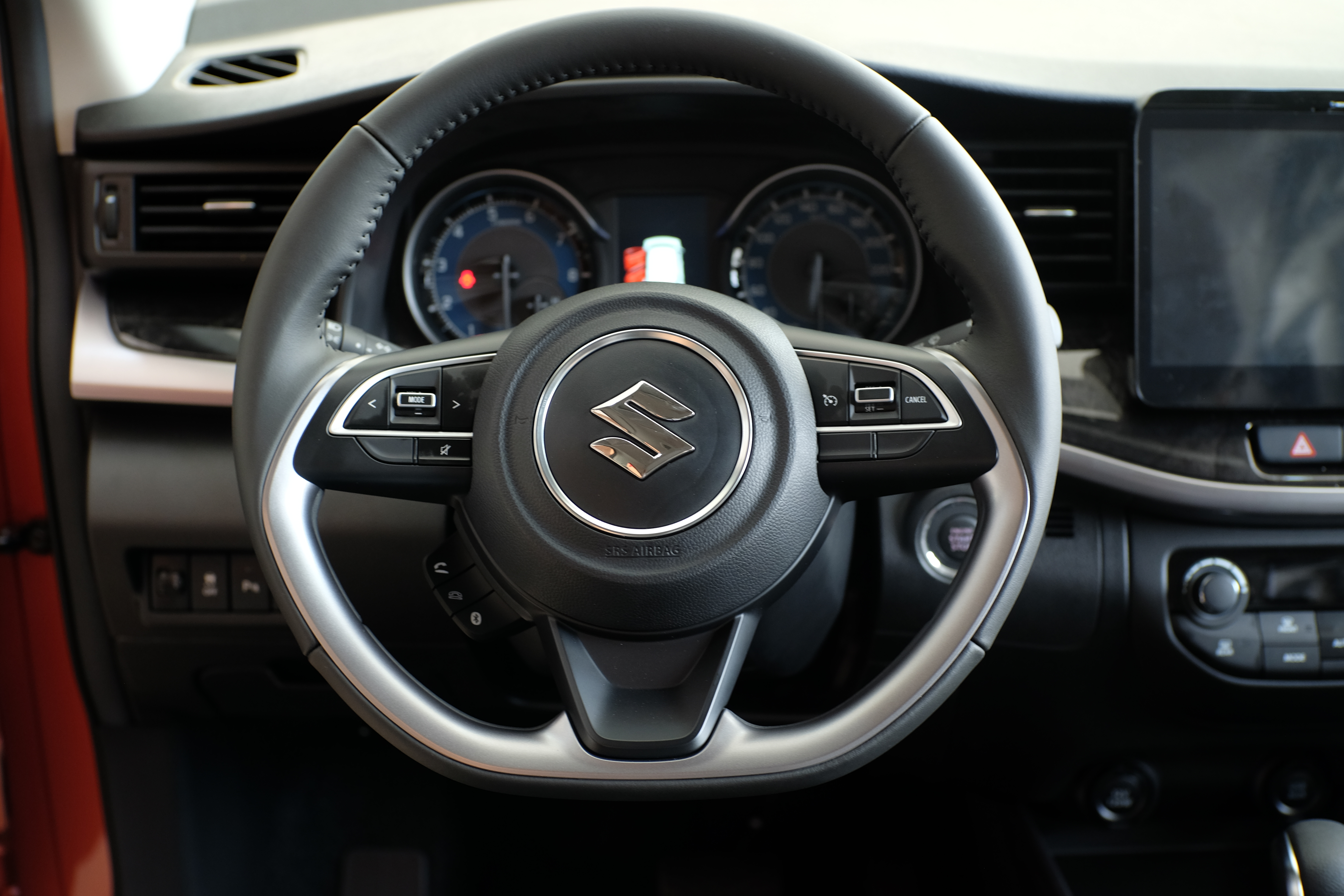 Suzuki Xl7 Hybrid 2025 vẫn sử dụng vô lăng bọc da kiểu 3 chấu D-cut rất thể thao phía dưới kết hợp chi tiết mạ bạc cho cảm giác trẻ trung, hiện đại hơn. Vô lăng xe tích hợp nút điều khiển âm thanh.