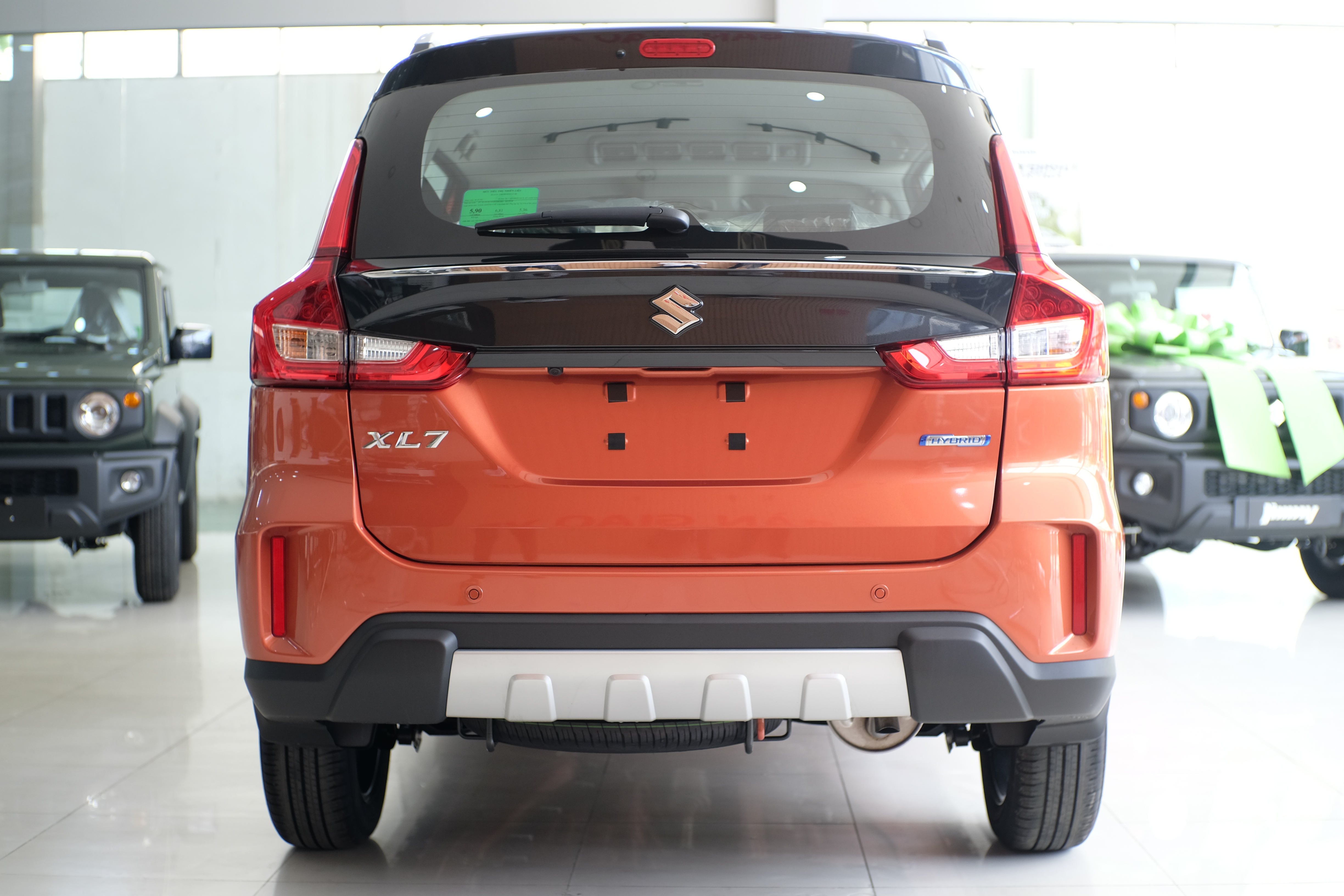 Thiết kế đuôi xe Suzuki XL7 Hybrid 2025 với cụm đèn hậu hình chữ L rất giống các mẫu xe như CVR, Volvo XC60. Nối giữa hai đèn pha là dải crom sáng bóng cùng với tấm nhựa đen to bản, bên trên là logo chữ S nổi bật. Thiết kế cản sau hầm hố như phía trước, tích hợp cả đèn phản quang nằm dọc hai bên.